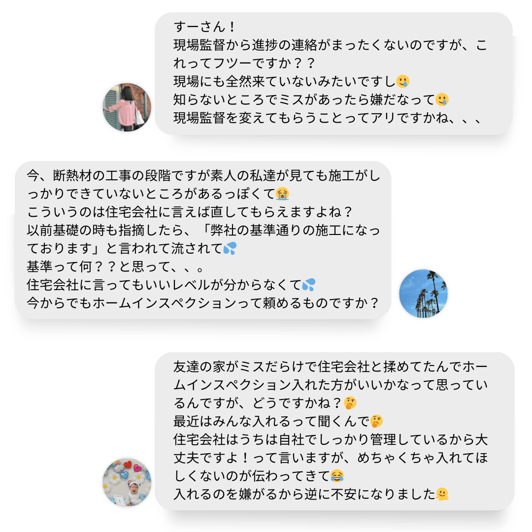 弊社代表鈴木が行う「すーさんの無料家づくり相談」でも工事への不安、トラブル相談、そしてホームインスペクションに関する質問が増加し多くの方が必要性を感じています。
